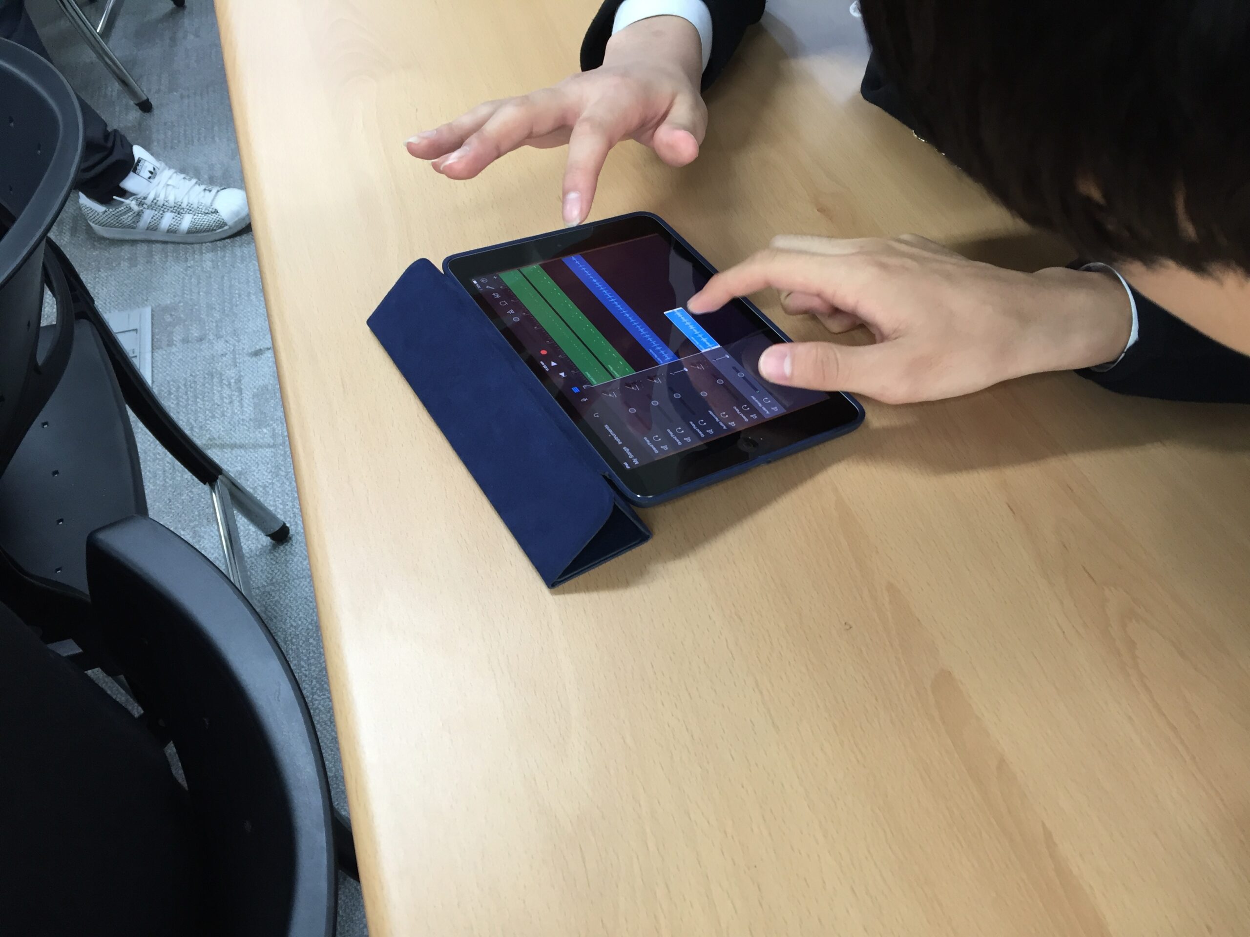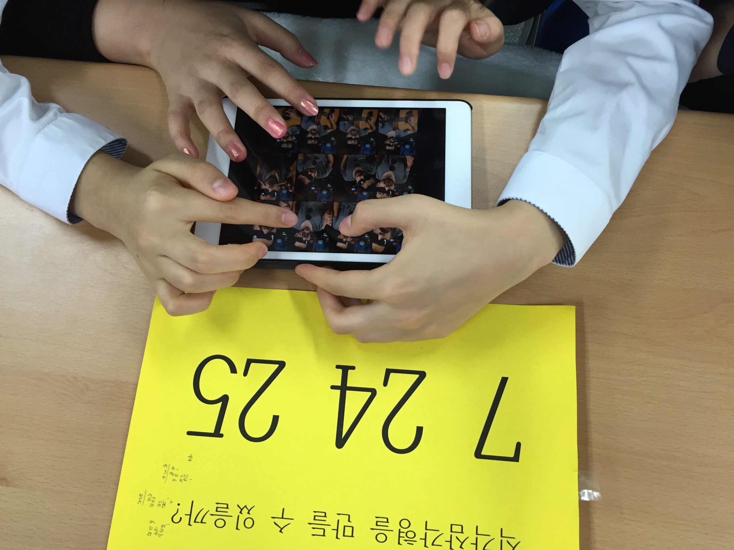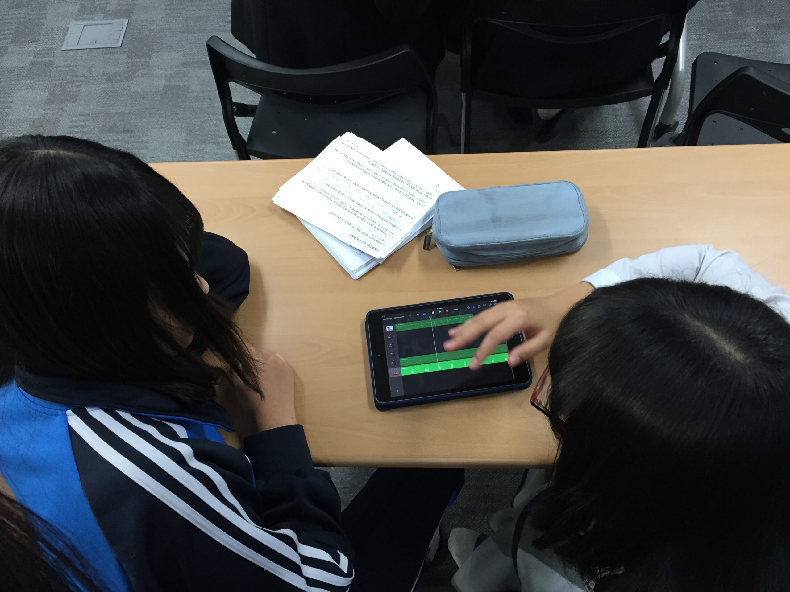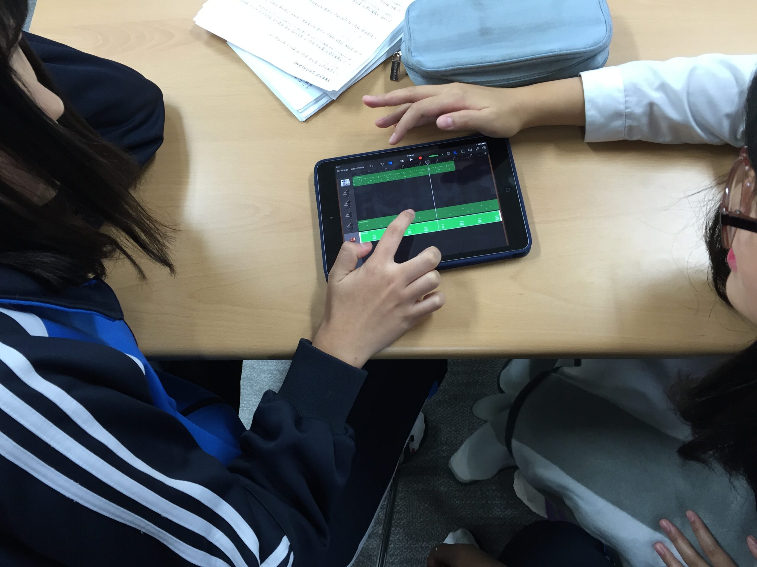 Anna Kim spoke both Korean and English but I had to do my best to communicate musical concepts through body percussion, singing and solfeggio. We had a collection of Math problems in yellow paper that had to be proven as authentic Pythagorean Triads before students could apply musical concepts. So when a Pythagorean Triad was taught (for example, 3 4 5) I could sing Mi, Fa So. This then led to the students using my iPads to compose their own pieces with MADPAD HD and GarageBand for IOS.